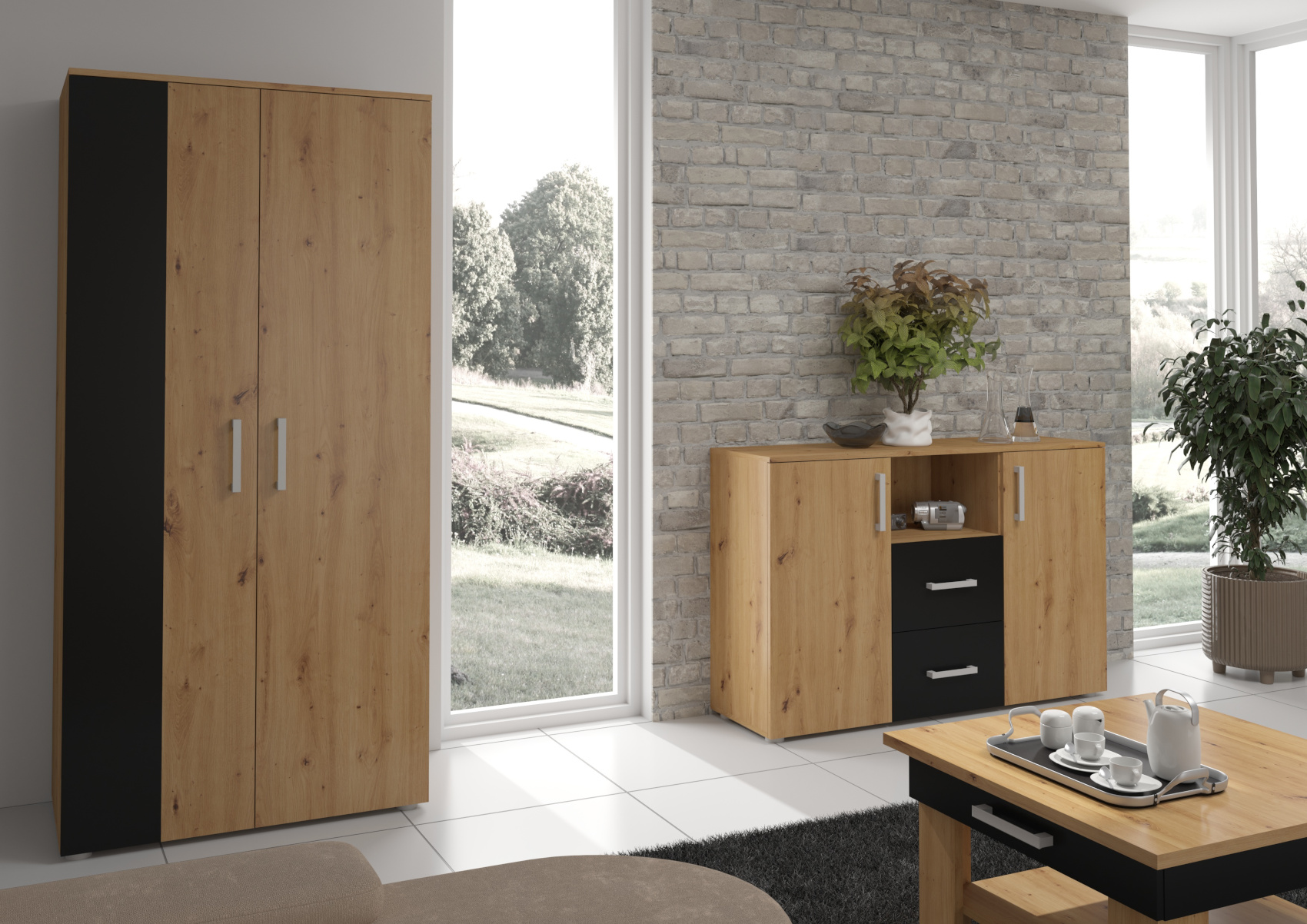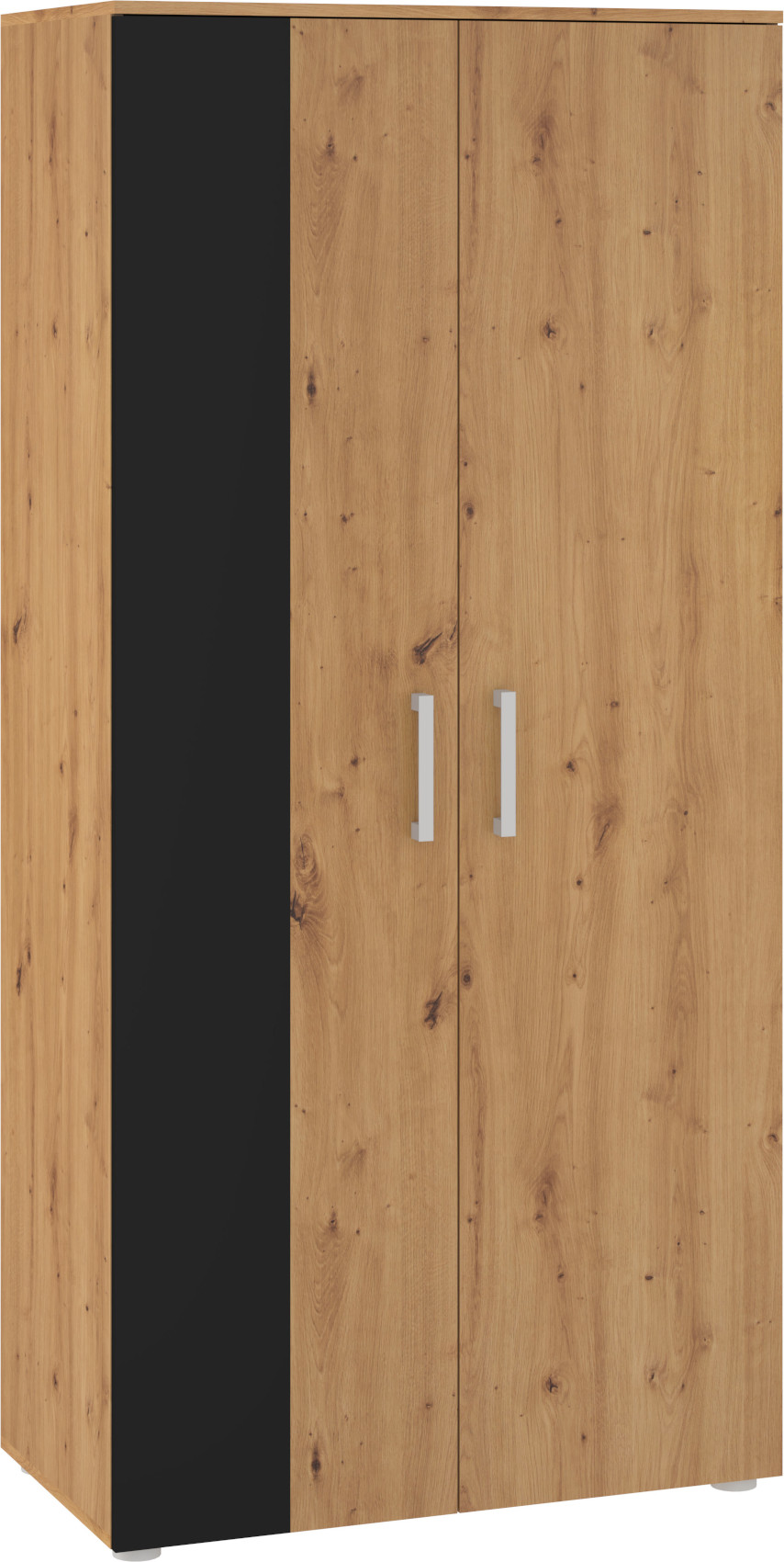 Součástí skříně jsou 2 plná dvířka, za kterými je vložena 1 dlouhá lakovaná police a 1 šatní tyč.