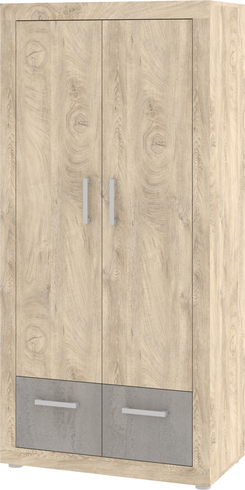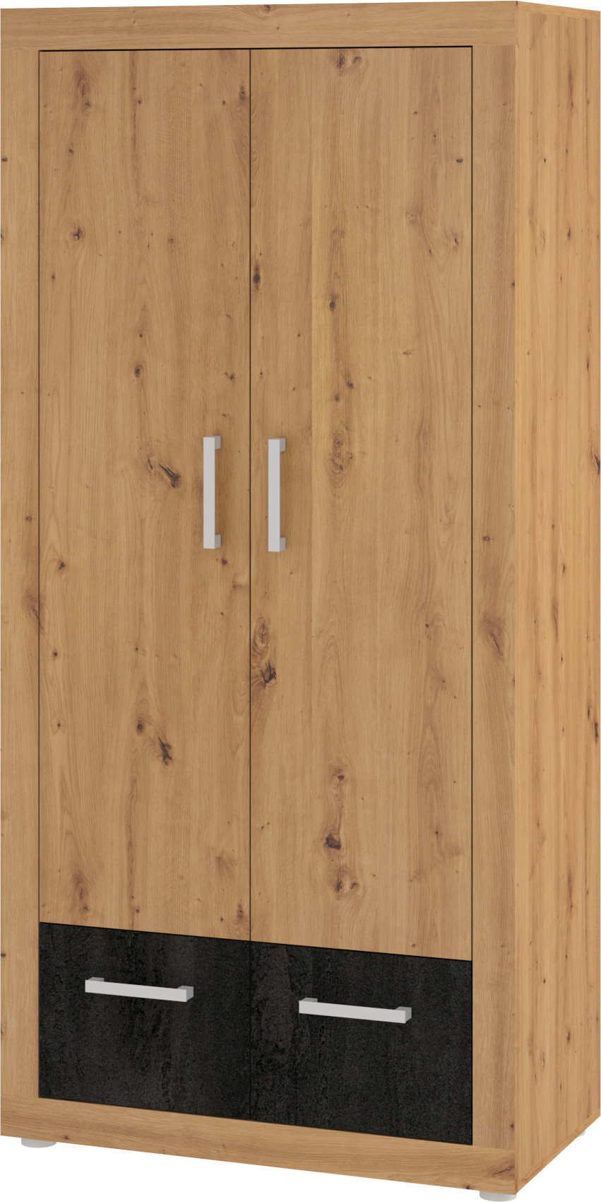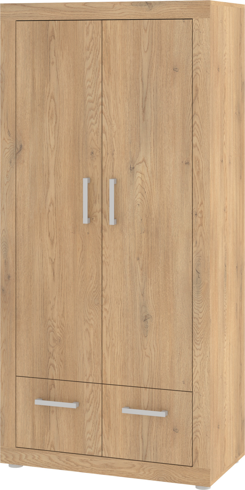 Součástí jsou 4 plná dvířka, za kterými jsou vloženy 2 dlouhé lakované police a 1 šatní tyč.