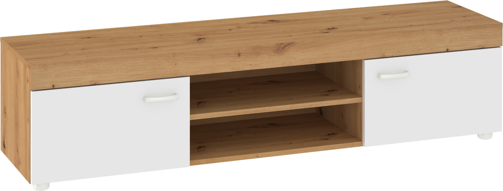 Součástí komody jsou 2 plná krajní dvířka. Uprostřed jsou 2 otevřené niky k uložení elektroniky či jiných nezbytností.