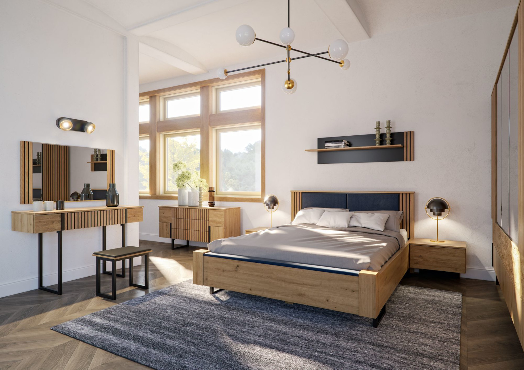 Moderní RTV stolek Gintaro maxi 2D1DU vás zaujme svým jedinečným designem. Černé lamely na přední straně nábytku dodají nádech elegance a kovové a neobyčejně tvarované nohy provzdušní váš interiér. Stolek je vyroben z masivního dubového dřeva a přírodní dubové dýhy. Kvalitní technologie lakování a moření navodí přírodní vzhled dřeva a zvýrazní tak jeho léta. Dvířka i zásuvky v celém systému mají tichý jednoduchý dotykový systém otevírání a zavírání - Push to open.