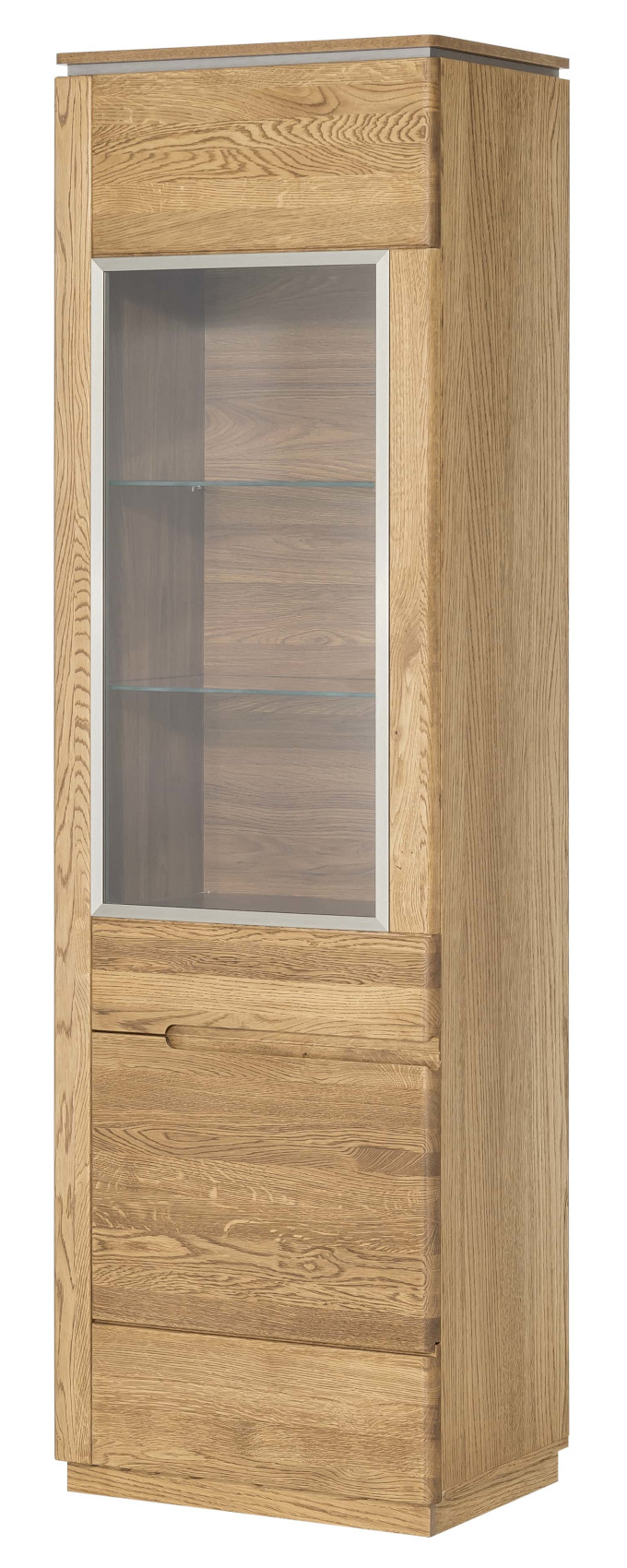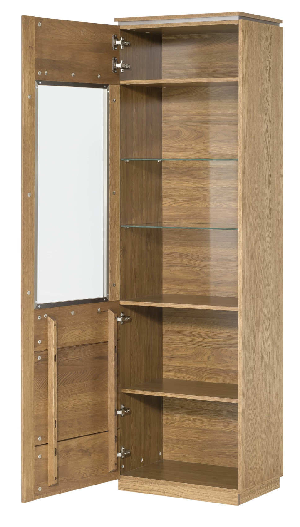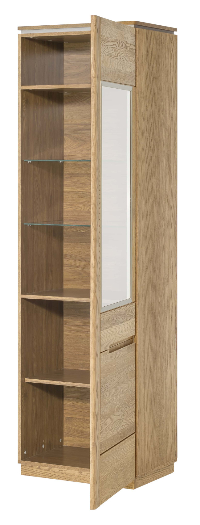 Moderní vitrína Montenegro vás zaujme svým elegantní designem. Přední část je vyrobena z masivního dubové dřeva a korpus z přírodní dubové dýhy. Jedinečným prvkem celého systému jsou kovové detaily pod horní deskou.
