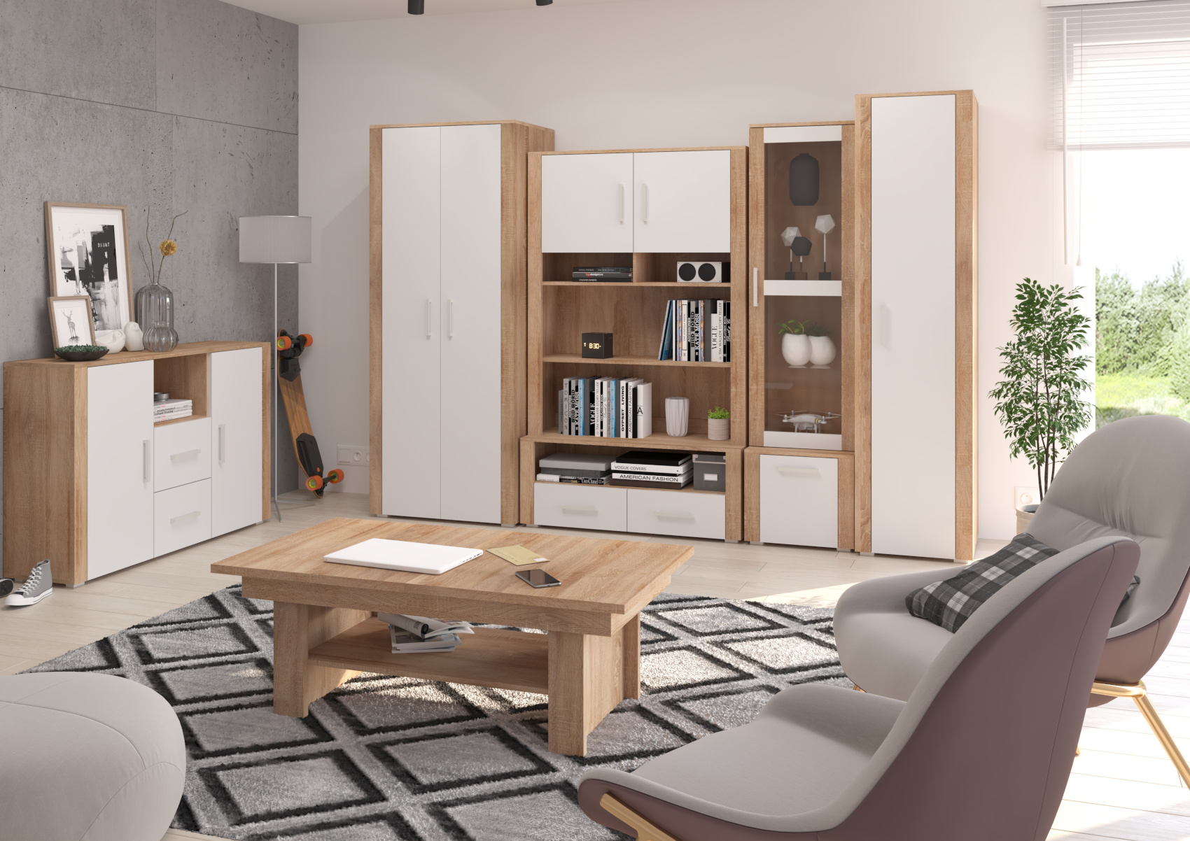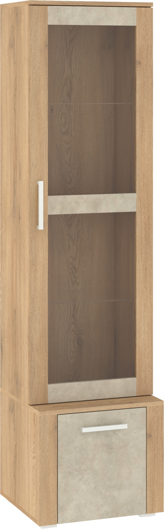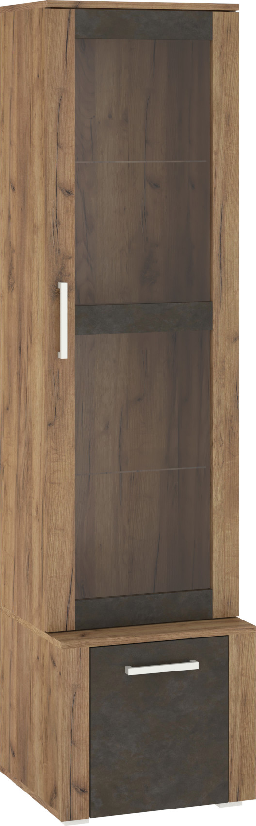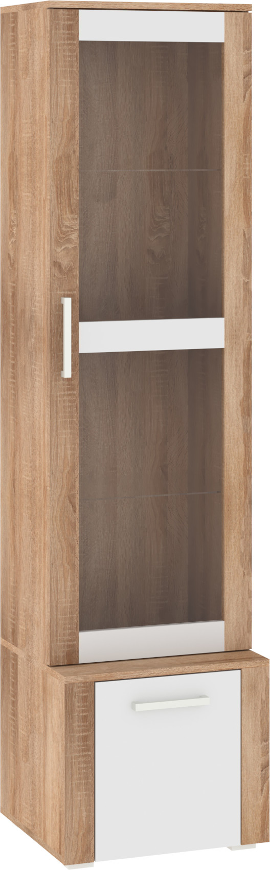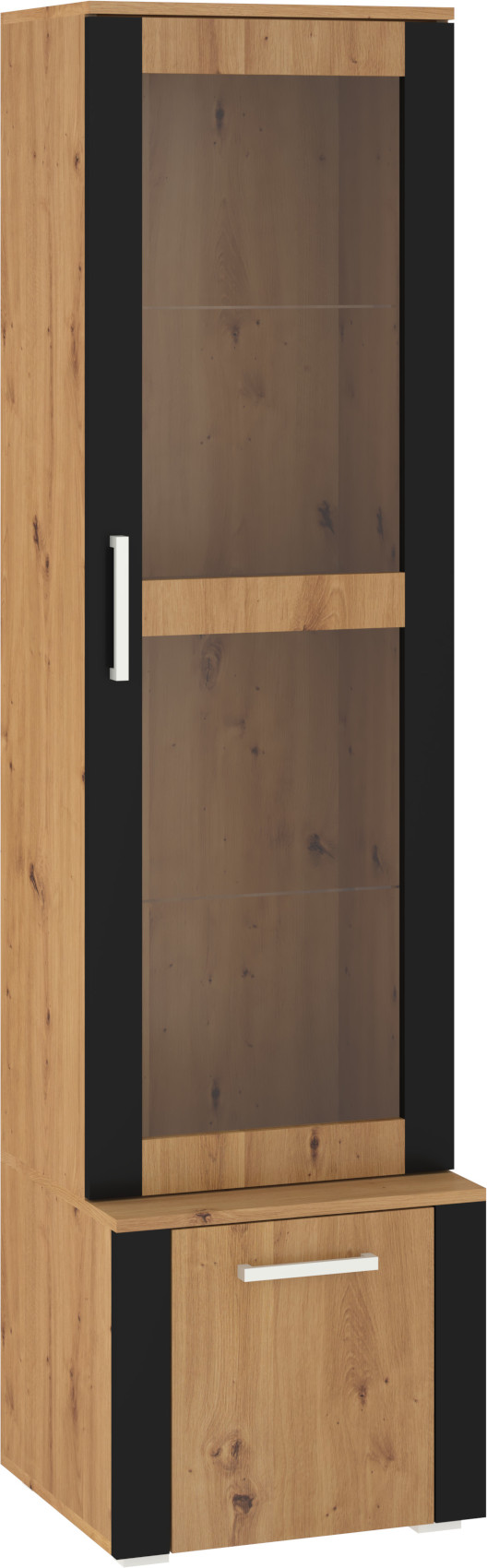 Vitrína Notti 08 se skvěle hodí do moderně zařízených interiérů. Zaujme vás svým moderním designem s přírodními prvky. Je vyrobena z kvalitních lamino desek o síle 16 mm. Příjemný design nábytku doplňují stříbrné úchytky z odolného tvrzeného plastu. Nabízíme vám několik barevných variant. Zajímavá kombinace barev dodává komodě ještě více na luxusu a nadčasovosti. Jednotlivé díly jsou variabilní, lze je navzájem kombinovat a vytvořit si tak svůj vysněný obývací pokoj.