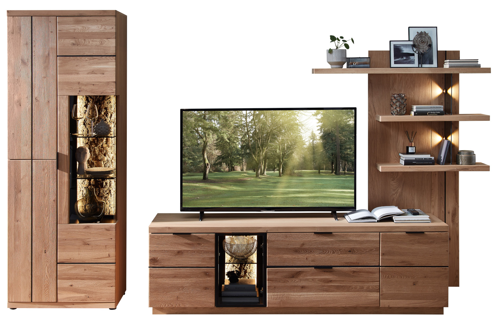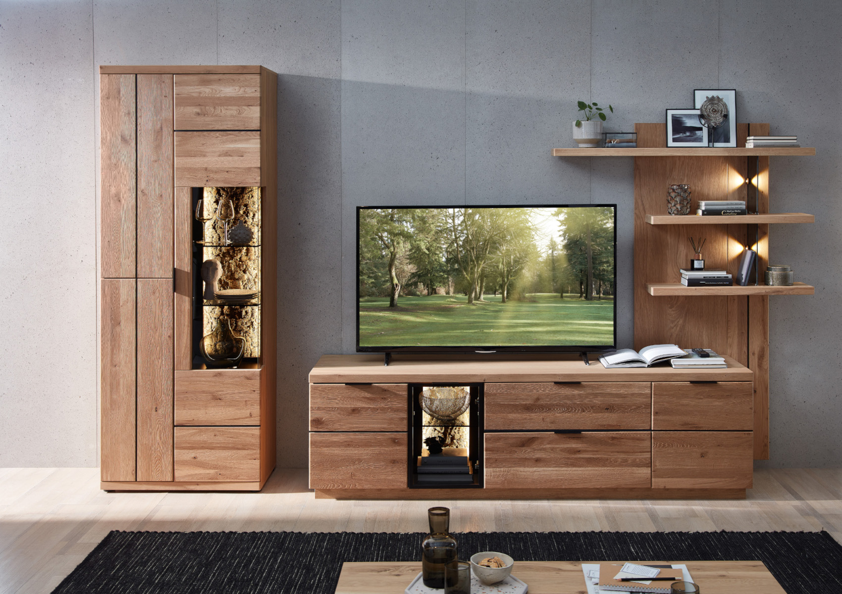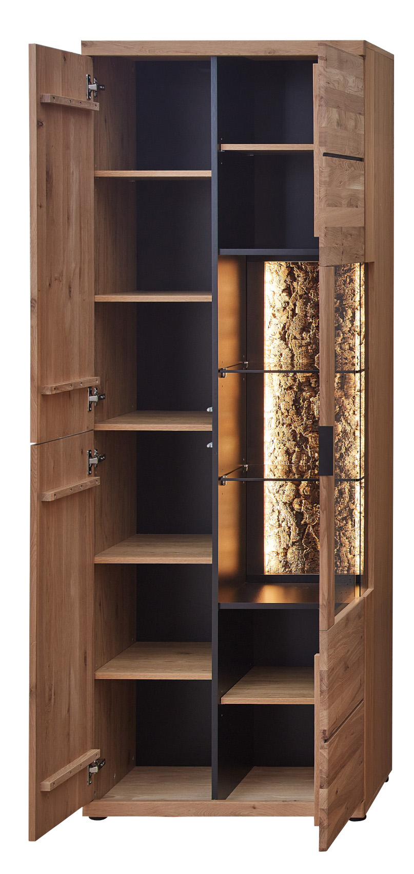 Dvoudveřová moderní vitrína Napoli 01 vás zaujme svým přírodním designem s viditelnou strukturou dřevěných lét. Přední dvířka, se systémem tichého dovírání, jsou vyrobena z masivního dubového dřeva a korpus z přírodní dubové dýhy, která je potažena fólií. Součástí vitríny jsou kovové černě lakované úchyty, které dodají nábytku nádech elegance. Nábytek stojí na velmi nízkých černých plastových nožkách.