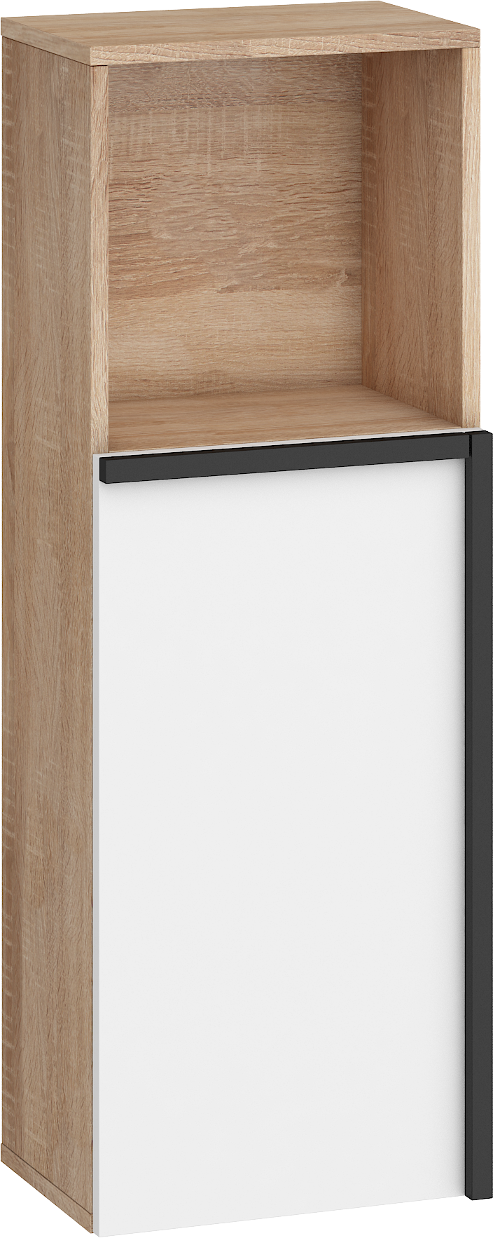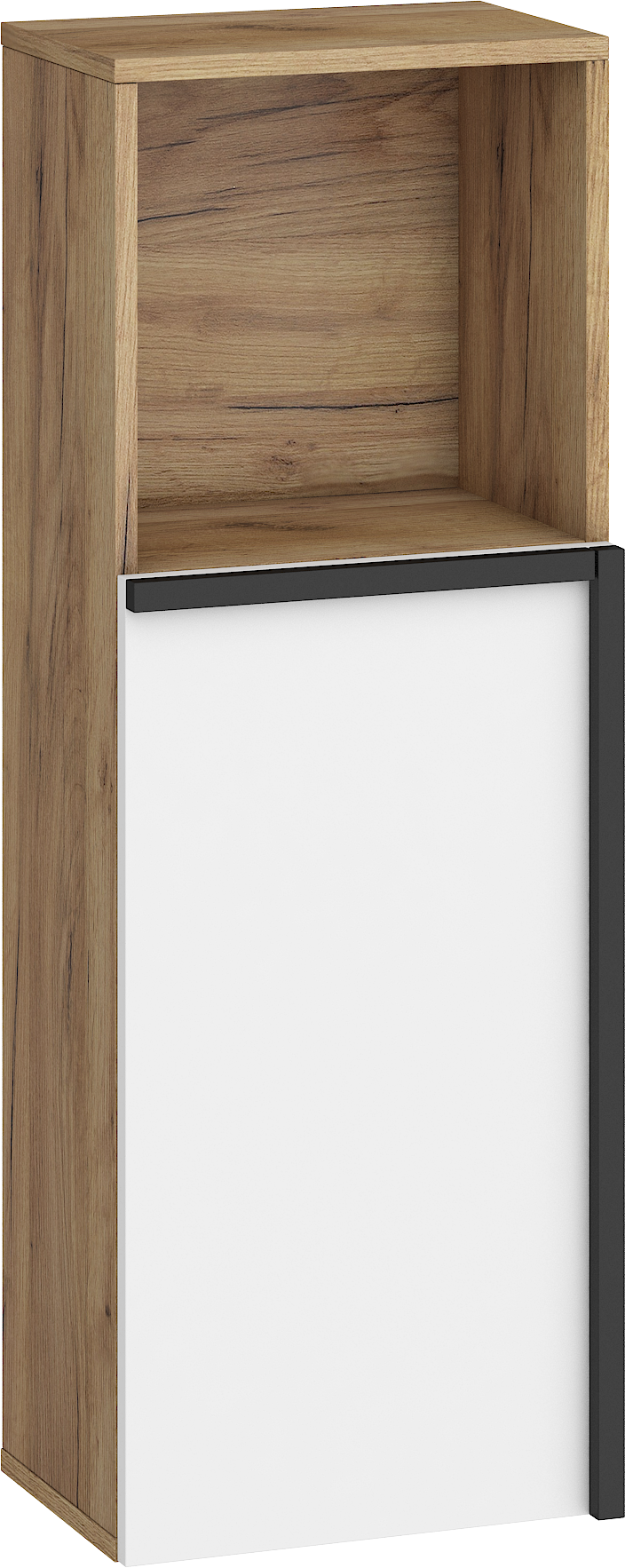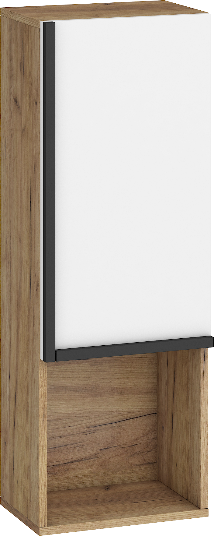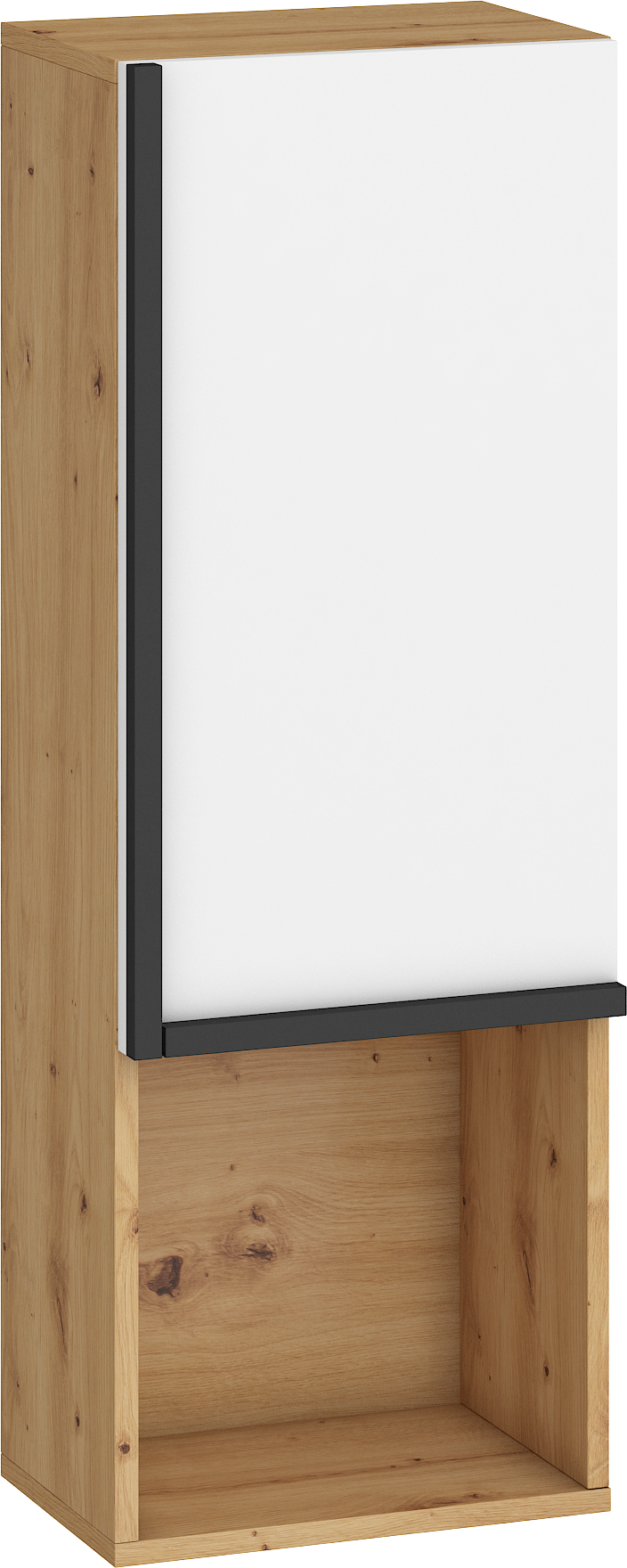 Součástí závěsné skříňky jsou 1 dvířka, za kterými je vložena 1 lakovaná police. Ve spodní či horní části (záleží, jak skříňku pověsíte) je otevřená nika k vystavení vašich oblíbených knih, dekorací či rámečků s fotografiemi.