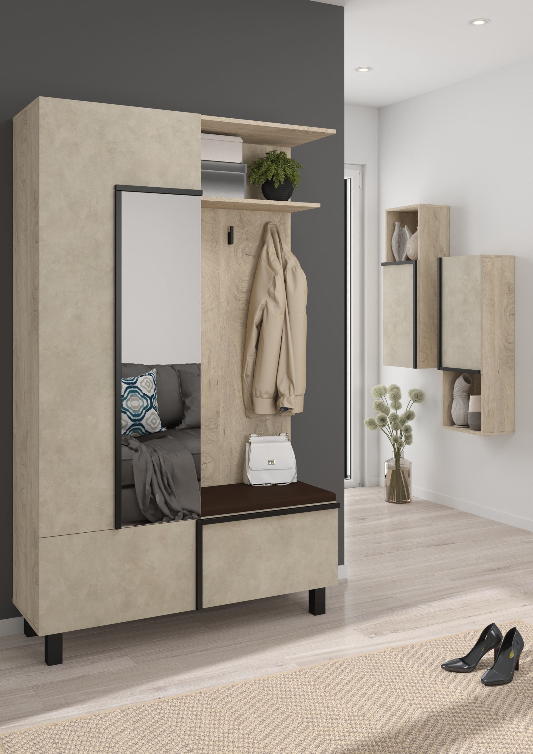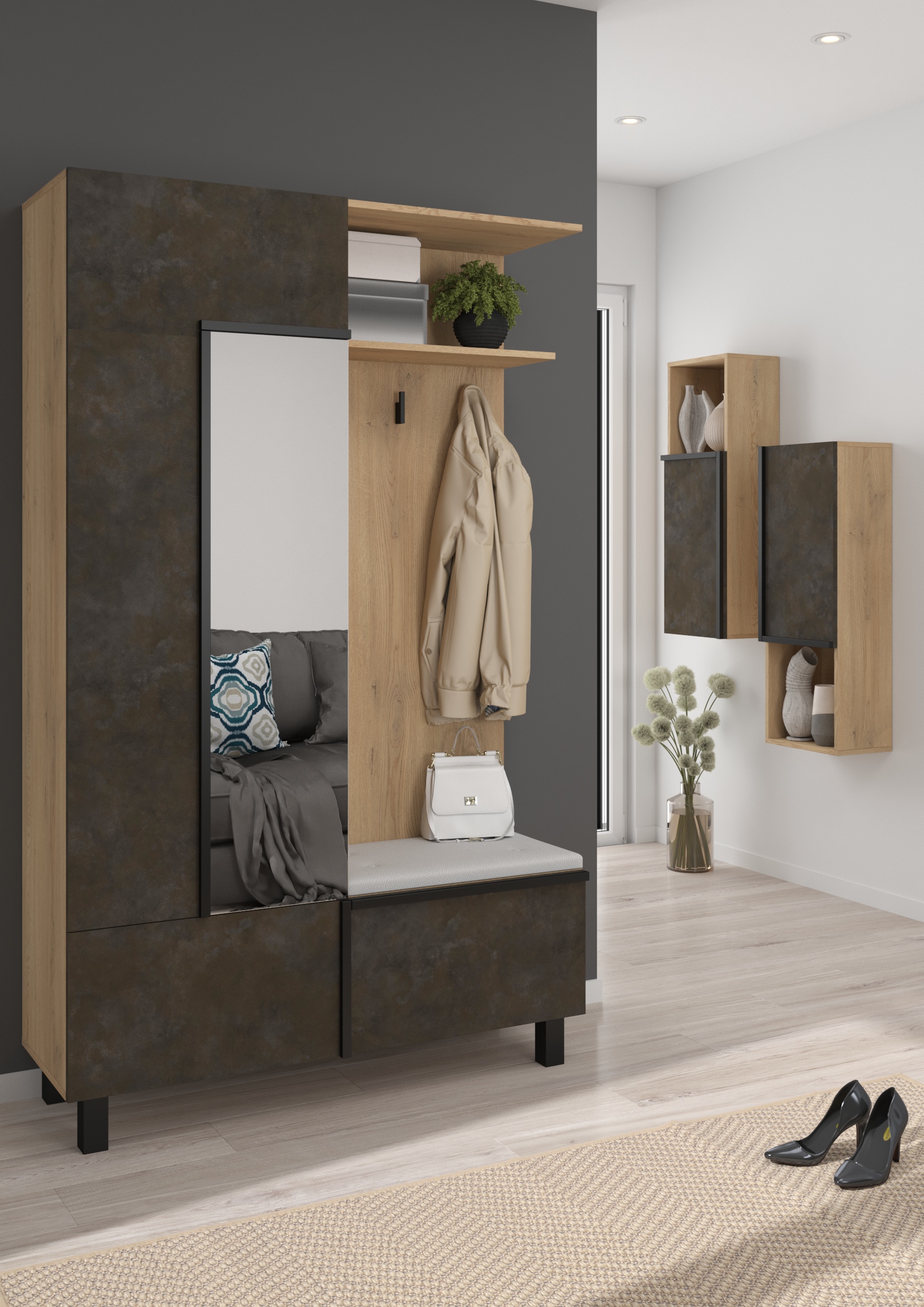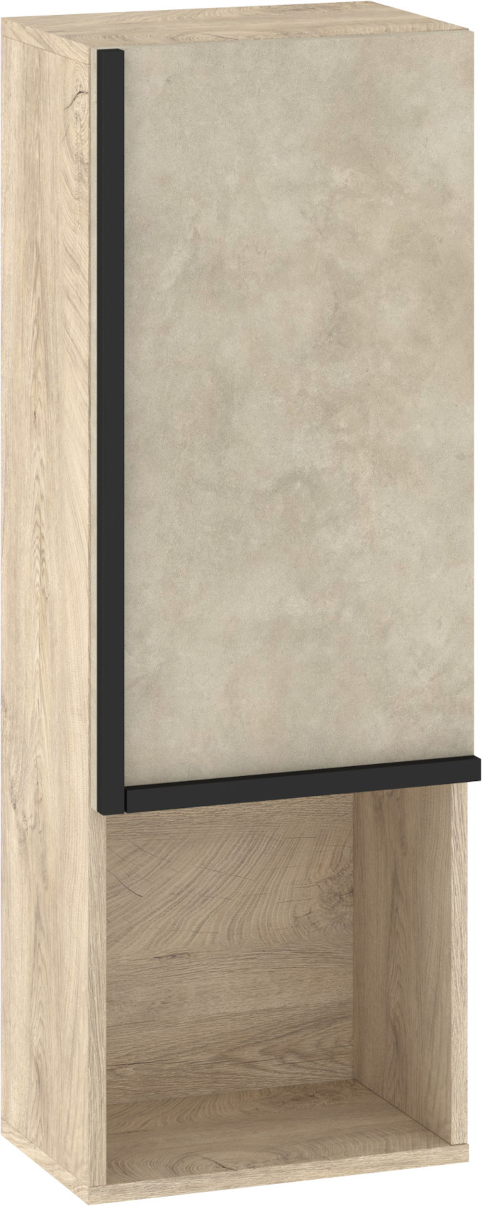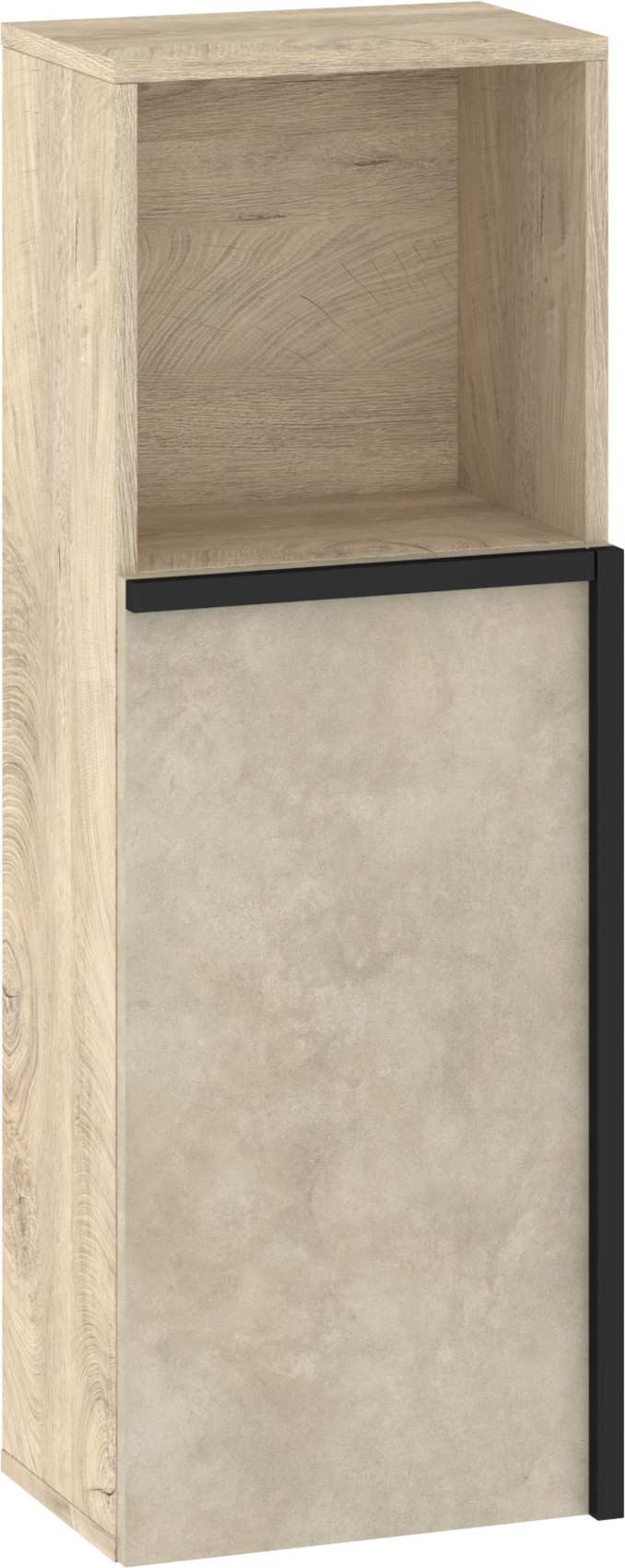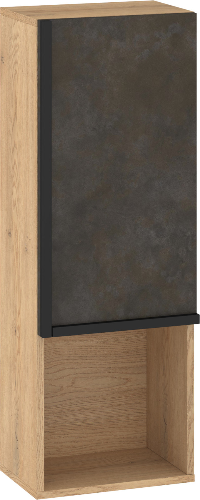Součástí závěsné skříňky jsou 1 dvířka, za kterými je vložena 1 lakovaná police. Ve spodní či horní části (záleží, jak skříňku pověsíte) je otevřená nika k vystavení vašich oblíbených knih, dekorací či rámečků s fotografiemi.