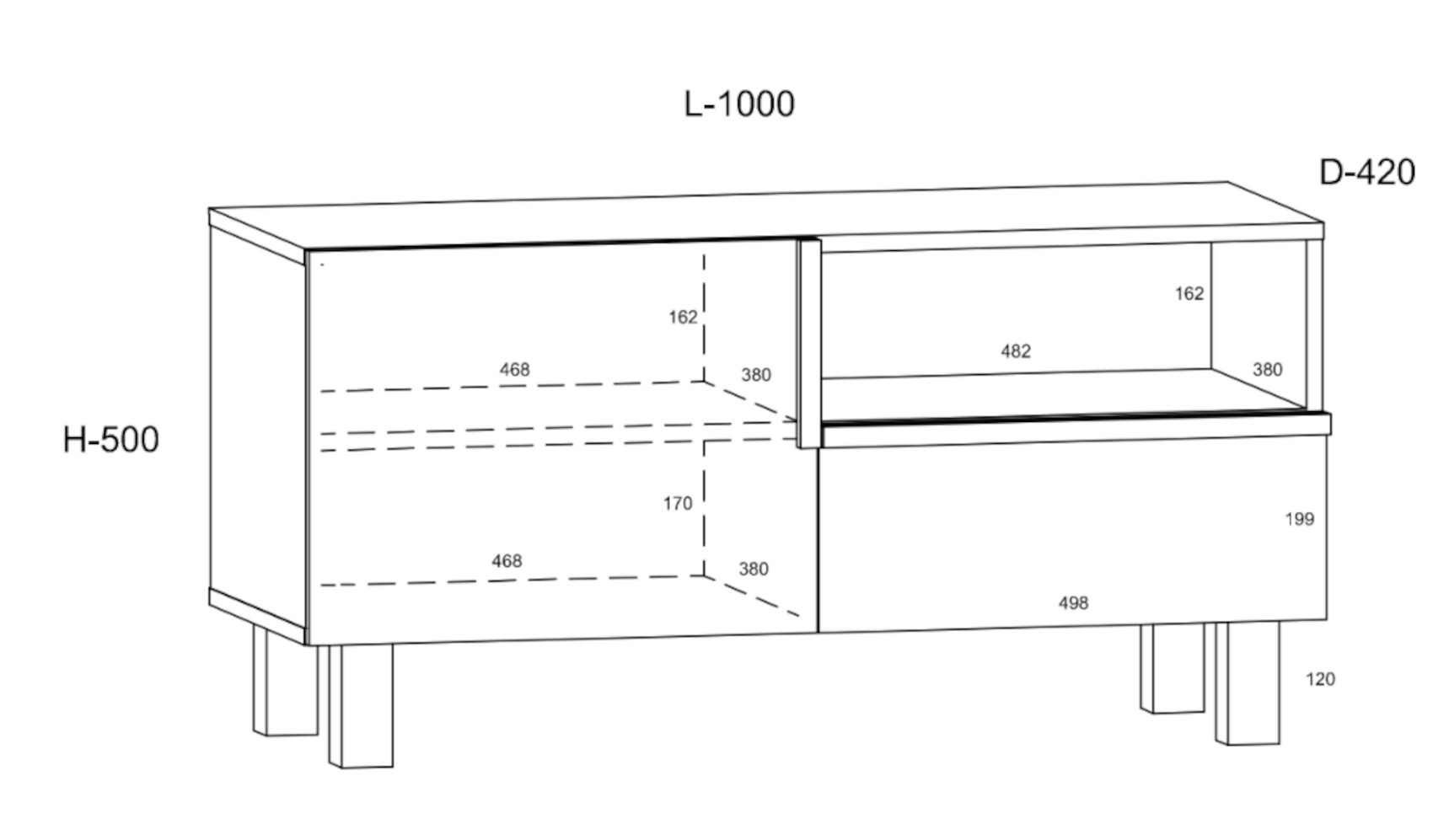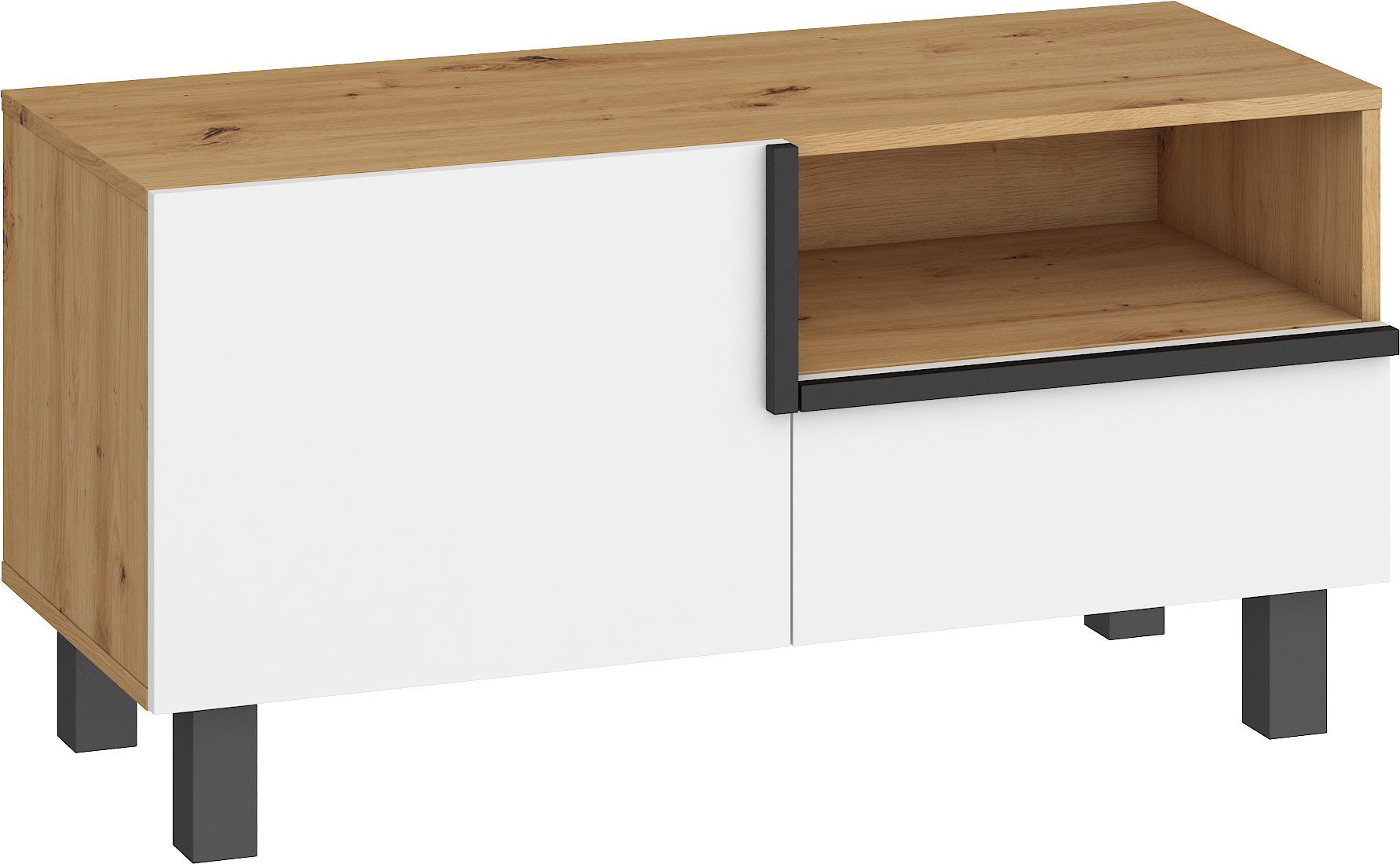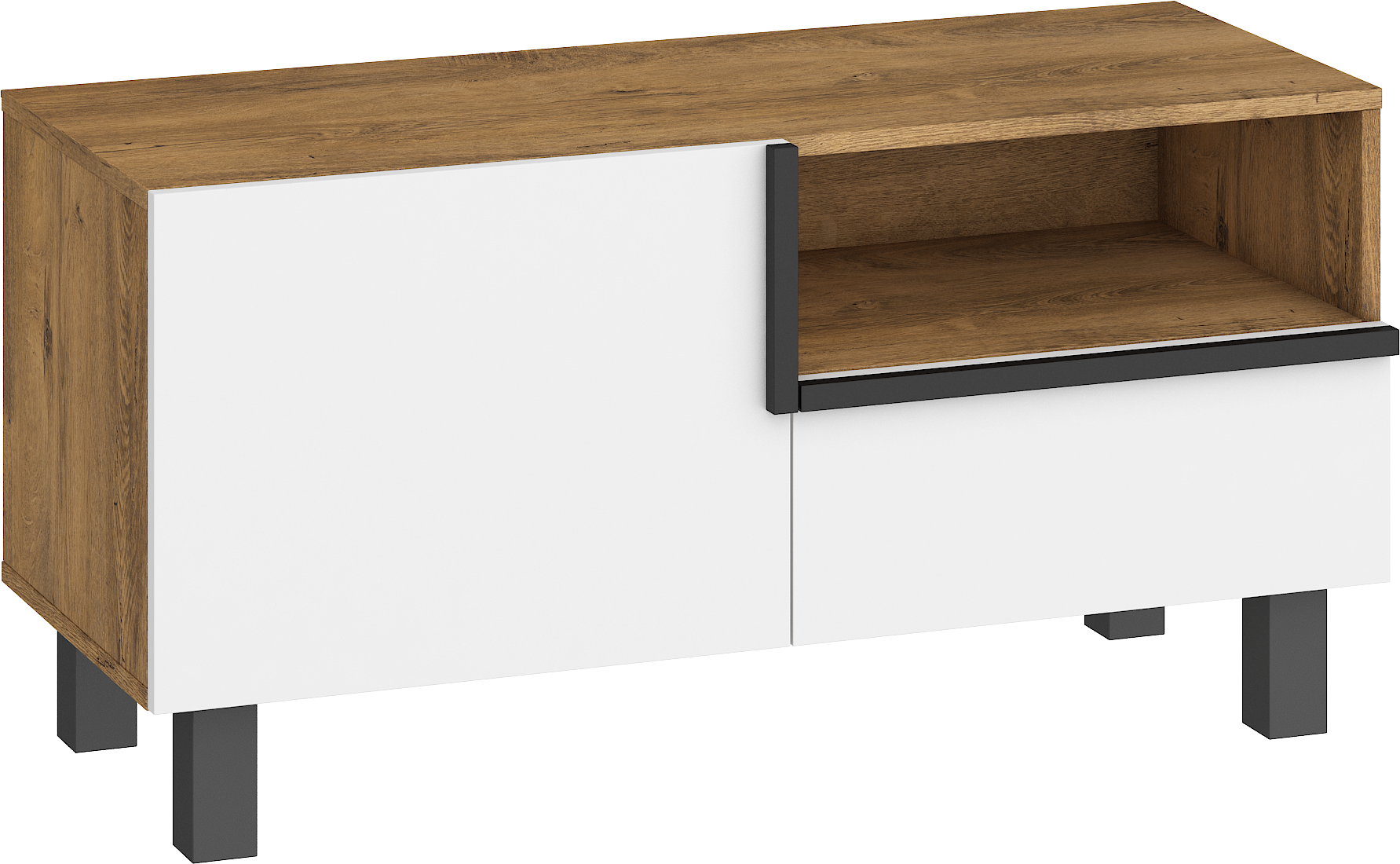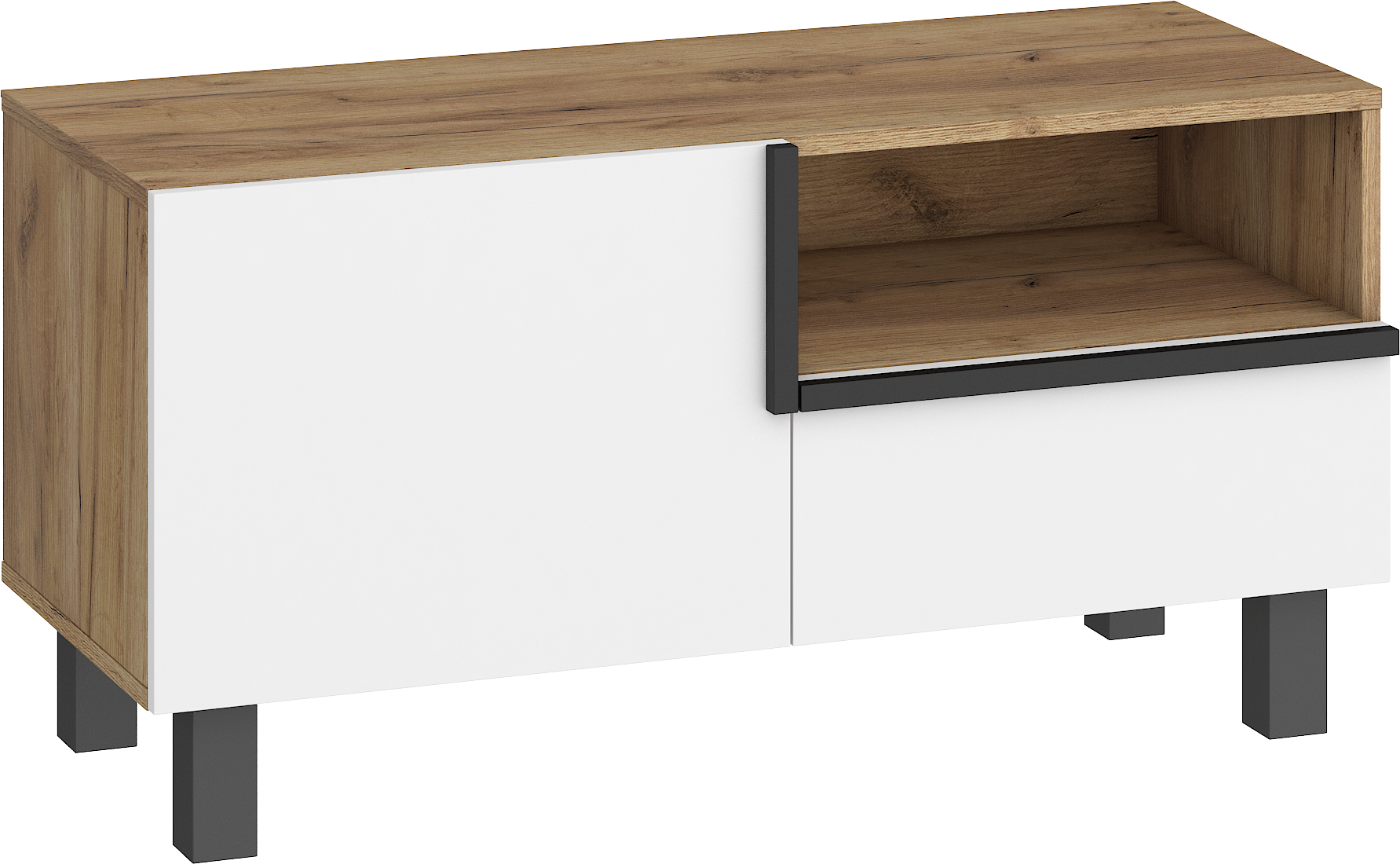Součástí televizního stolku jsou 1 dvířka, za kterými je vložena 1 lakovaná police. V pravé části je zásuvka na kovových pojezdech a nad ní otevřená nika k uložení elektroniky.